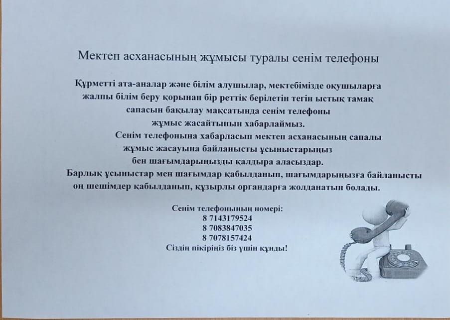 | 1 | Мектеп асханасының жұмысы туралы сенім телефоны | |